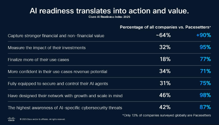 Cisco has unveiled findings from its third annual AI Readiness Index 2025, revealing that the most AI-ready organizations, known as the ‘Pacesetters’, are significantly outperforming their peers in unlocking measurable business value from artificial intelligence. According to the report, these top-performing companies are three times more likely to move AI pilots into production and 72% more likely to report measurable outcomes from AI adoption compared to less mature organizations.