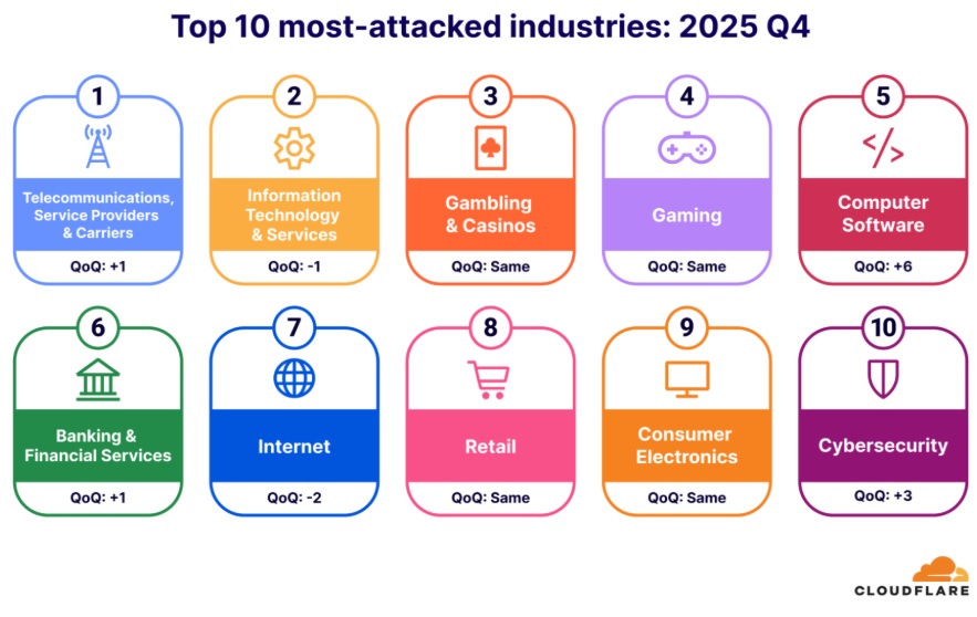 3. Infected Android TVs — part of the Aisuru-Kimwolf botnet — bombarded Cloudflare’s network with hyper-volumetric HTTP DDoS attacks, while Telcos emerged as the most-attacked industry.