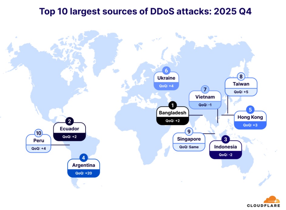 Bangladesh dethroned Indonesia as the largest source of DDoS attacks in the fourth quarter of 2025. Indonesia dropped to the third spot, after spending a year as the top source of DDoS attacks. Ecuador also jumped two spots, making it the second-largest source.