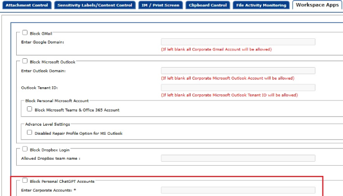 The ChatGPT tenant control extends this capability to AI platforms. When an employee attempts to access ChatGPT, the DLP system verifies the authentication method. If the user tries to authenticate via personal Google, Apple, or Microsoft accounts, access is blocked. Only corporate domain credentials – linked to the organization’s ChatGPT Enterprise or Business workspace – are permitted.